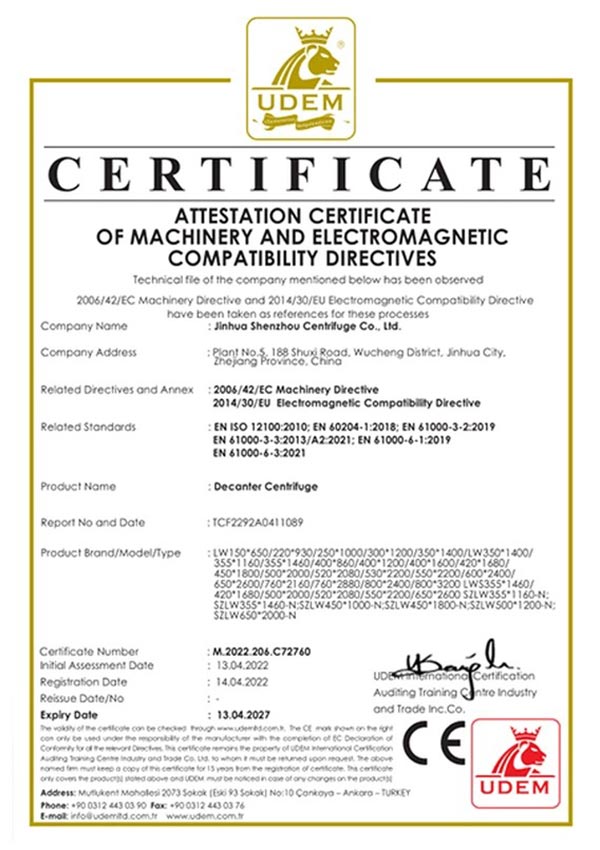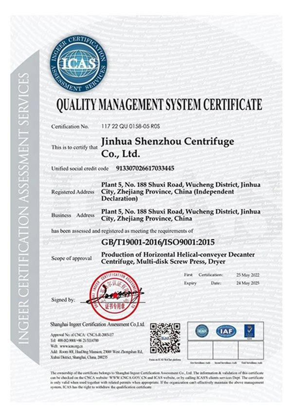 Jinhua Shenzhou Centrifuge Co., Ltd. specializes in the R&D and manufacturing of solid-liquid separation equipment. Our main products include various centrifuges (such as decanter centrifuges, three-phase centrifuges, oilfield centrifuges, etc.), sludge dewatering systems, and related supporting equipment.